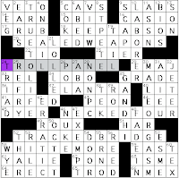 Favorite fill: GAWK, or [Rubberneck]; KIBOSH, or [Stopper of things]; THE AISLE, clued as [A ring bearer may go down it]; BELIZE, formerly British Honduras, a [Commonwealth country in Central America]; SAD TO SAY, or ["Alas"]; POTPIE, or [Entree from the frozen food department]; [Policy ___] WONK; HAS DIBS, or [Lays a claim (on)]; VANISH, or [Dematerialize]; the Spanish word JEFE, or [Baja boss]; SHERPA clued as [Guide for Hillary], not Hillary Clinton but Edmund Hillary; and WIG OUT, or [Freak]. What is that, a dozen great entries? This, my friends, is what makes Paula Gamache's puzzles so much fun.
