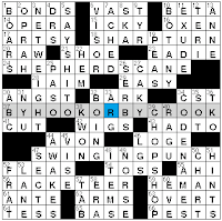 The theme is embodied by 37A: [How 18-, 24-, 47- and 56-Across may be defined] is BY HOOK OR BY CROOK, meaning that those four answers can be defined by the wordhook or the word crook. In fact, there are two hooks—18A is a SHARP TURN and 47A is a SWINGING PUNCH—and two crooks—24A is a SHEPHERD'S CANE (though I think of canes as being shorter, more like hip-high, and a shepherd's crook/staff as being head-high) and 56A is a RACKETEER.