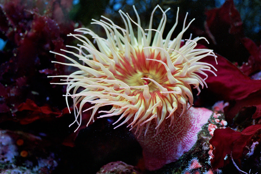 Alan Olschwang's LA Times crossword places MUSIC and GENRE in symmetrical spots to explain that the theme entries begin with just that—ROCKET FUEL, PUNKY BREWSTER (['80s title sitcom role for Soleil Moon Frye], and a show I never saw), RAPID RESPONSE, and POPPY SEEDS all are longer words with contemporary music genres at their starts. A SPONGE may be used as a [Counter cleaner], but if that sponge has already picked up bacteria from one spot in the kitchen, it'll be spreading it all over the counter. (Wash those sponges in the washer or dishwasher and let them dry thoroughly to kill germs. This has been your public service announcement for 2008.) The POLYP returns, again clued as a [Coral component]; sea anemones, like that pictured at right, are also polyps and are more fun to look at since their tentacles move.